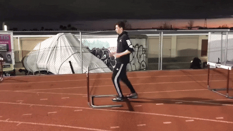 > PLUS, when the athlete hops, the trail leg must now push his hips not simply up but also slightly forward in order to clear the hurdle. The typical HS athletes will want to set up for this movement with the crossbar in the crook of the knee — or even under the thigh — where simply shifting their weight forward will allow the hips to clear the hurdle without much push from the trail leg.